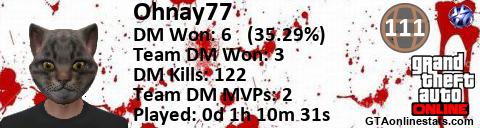 [URL=http://GTAonlinestats.com/showplayer/Ohnay77][IMG]http://GTAonlinestats.com/dmsignature/Ohnay77/sig.png[/IMG][/URL]