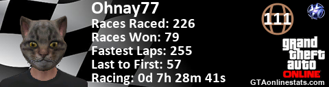 <a href="http://GTAonlinestats.com/showplayer/Ohnay77"><img src="http://GTAonlinestats.com/racesignature/Ohnay77/sig.png" alt="Ohnay77" border="0" /></a>