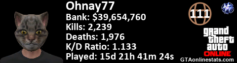 [URL=http://GTAonlinestats.com/showplayer/Ohnay77][IMG]http://GTAonlinestats.com/greysignature/Ohnay77/sig.png[/IMG][/URL]