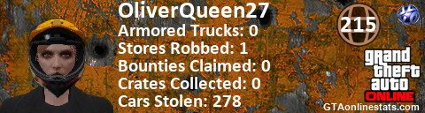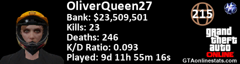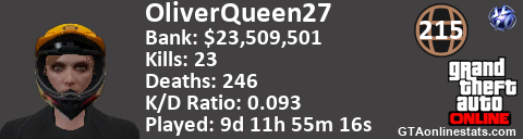 [URL=http://GTAonlinestats.com/showplayer/OliverQueen27][IMG]http://GTAonlinestats.com/signature/OliverQueen27/sig.png[/IMG][/URL]