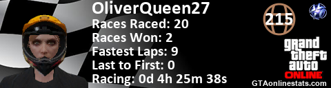 <a href="http://GTAonlinestats.com/showplayer/OliverQueen27"><img src="http://GTAonlinestats.com/racesignature/OliverQueen27/sig.png" alt="OliverQueen27" border="0" /></a>