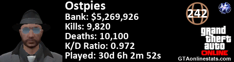 [URL=http://GTAonlinestats.com/showplayer/Ostpies][IMG]http://GTAonlinestats.com/signature/Ostpies/sig.png[/IMG][/URL]