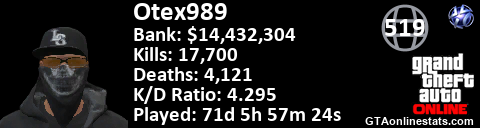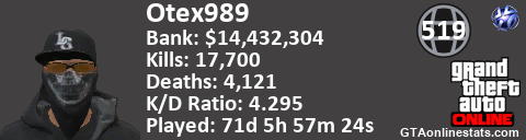 <a href="http://GTAonlinestats.com/showplayer/Otex989"><img src="http://GTAonlinestats.com/randomsignature/Otex989/sig.png" alt="Otex989" border="0" /></a>