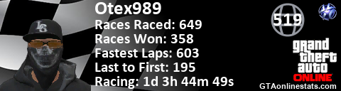 <a href="http://GTAonlinestats.com/showplayer/Otex989"><img src="http://GTAonlinestats.com/racesignature/Otex989/sig.png" alt="Otex989" border="0" /></a>