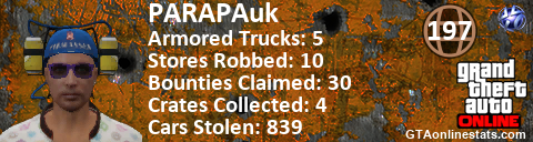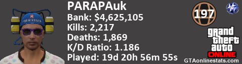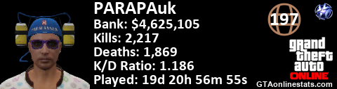 [URL=http://GTAonlinestats.com/showplayer/PARAPAuk][IMG]http://GTAonlinestats.com/greysignature/PARAPAuk/sig.png[/IMG][/URL]