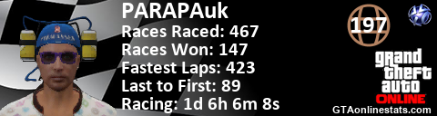 [URL=http://GTAonlinestats.com/showplayer/PARAPAuk][IMG]http://GTAonlinestats.com/racesignature/PARAPAuk/sig.png[/IMG][/URL]