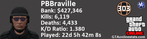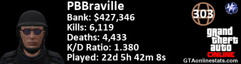 [URL=http://GTAonlinestats.com/showplayer/PBBraville/2][IMG]http://GTAonlinestats.com/signature/PBBraville/2/sig.png[/IMG][/URL]