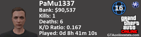 <a href="http://GTAonlinestats.com/showplayer/PaMu1337"><img src="http://GTAonlinestats.com/dmsignature/PaMu1337/sig.png" alt="PaMu1337" border="0" /></a>