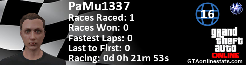 <a href="http://GTAonlinestats.com/showplayer/PaMu1337"><img src="http://GTAonlinestats.com/racesignature/PaMu1337/sig.png" alt="PaMu1337" border="0" /></a>
