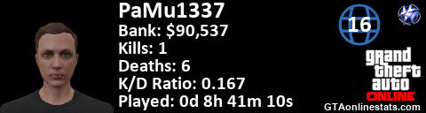 <a href="http://GTAonlinestats.com/showplayer/PaMu1337"><img src="http://GTAonlinestats.com/greysignature/PaMu1337/sig.png" alt="PaMu1337" border="0" /></a>