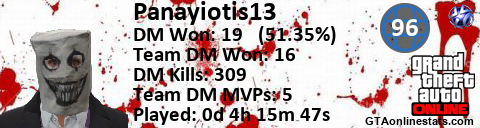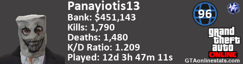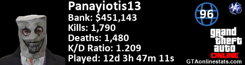 [URL=http://GTAonlinestats.com/showplayer/Panayiotis13][IMG]http://GTAonlinestats.com/signature/Panayiotis13/sig.png[/IMG][/URL]