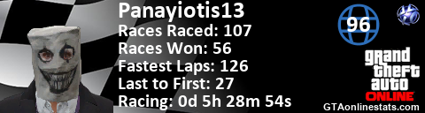 <a href="http://GTAonlinestats.com/showplayer/Panayiotis13"><img src="http://GTAonlinestats.com/racesignature/Panayiotis13/sig.png" alt="panayiotis13" border="0" /></a>