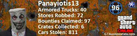 [URL=http://GTAonlinestats.com/showplayer/Panayiotis13][IMG]http://GTAonlinestats.com/crimesignature/Panayiotis13/sig.png[/IMG][/URL]