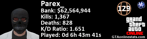 [URL=http://GTAonlinestats.com/showplayer/Parex_/2][IMG]http://GTAonlinestats.com/greysignature/Parex_/2/sig.png[/IMG][/URL]