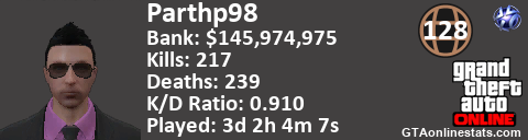 [URL=http://GTAonlinestats.com/showplayer/Parthp98][IMG]http://GTAonlinestats.com/signature/Parthp98/sig.png[/IMG][/URL]