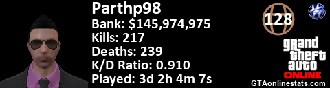 <a href="http://GTAonlinestats.com/showplayer/Parthp98"><img src="http://GTAonlinestats.com/randomsignature/Parthp98/sig.png" alt="Parthp98" border="0" /></a>
