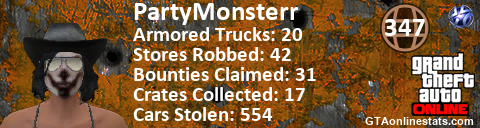[URL=http://GTAonlinestats.com/showplayer/PartyMonsterr][IMG]http://GTAonlinestats.com/crimesignature/PartyMonsterr/sig.png[/IMG][/URL]