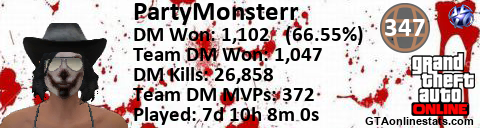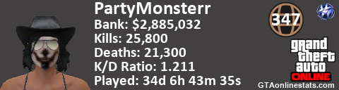 [URL=http://GTAonlinestats.com/showplayer/PartyMonsterr][IMG]http://GTAonlinestats.com/dmsignature/PartyMonsterr/sig.png[/IMG][/URL]