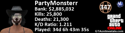 [URL=http://GTAonlinestats.com/showplayer/PartyMonsterr][IMG]http://GTAonlinestats.com/signature/PartyMonsterr/sig.png[/IMG][/URL]