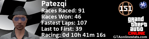 <a href="http://GTAonlinestats.com/showplayer/Patezqi"><img src="http://GTAonlinestats.com/racesignature/Patezqi/sig.png" alt="Patezqi" border="0" /></a>
