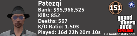 <a href="http://GTAonlinestats.com/showplayer/Patezqi"><img src="http://GTAonlinestats.com/signature/Patezqi/sig.png" alt="Patezqi" border="0" /></a>