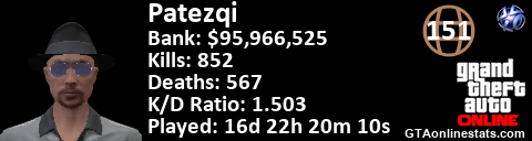 [URL=http://GTAonlinestats.com/showplayer/Patezqi][IMG]http://GTAonlinestats.com/dmsignature/Patezqi/sig.png[/IMG][/URL]
