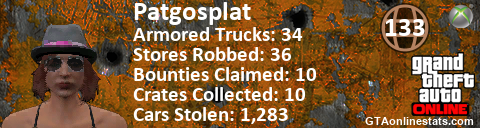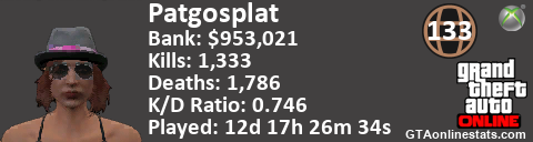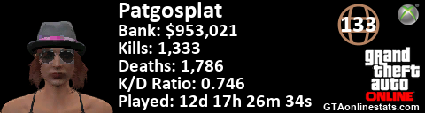 [URL=http://GTAonlinestats.com/showplayer/Patgosplat/2][IMG]http://GTAonlinestats.com/signature/Patgosplat/2/sig.png[/IMG][/URL]