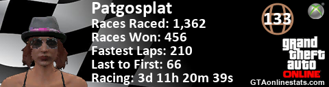 <a href="http://GTAonlinestats.com/showplayer/Patgosplat/2"><img src="http://GTAonlinestats.com/racesignature/Patgosplat/2/sig.png" alt="Patgosplat" border="0" /></a>