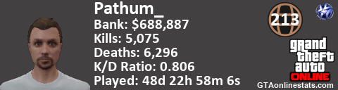 [URL=http://GTAonlinestats.com/showplayer/Pathum_][IMG]http://GTAonlinestats.com/greysignature/Pathum_/sig.png[/IMG][/URL]