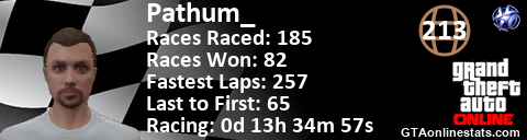 [URL=http://GTAonlinestats.com/showplayer/Pathum_][IMG]http://GTAonlinestats.com/racesignature/Pathum_/sig.png[/IMG][/URL]