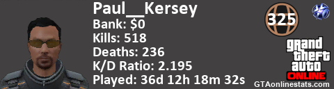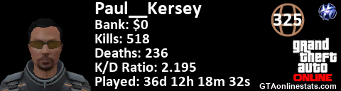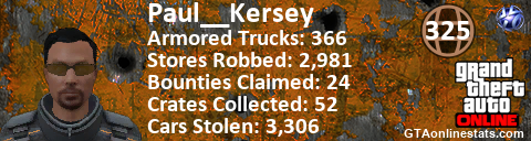 [URL=http://GTAonlinestats.com/showplayer/Paul__Kersey][IMG]http://GTAonlinestats.com/signature/Paul__Kersey/sig.png[/IMG][/URL]