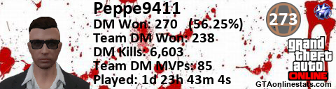 [URL=http://GTAonlinestats.com/showplayer/Peppe9411][IMG]http://GTAonlinestats.com/dmsignature/Peppe9411/sig.png[/IMG][/URL]