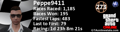 [URL=http://GTAonlinestats.com/showplayer/Peppe9411][IMG]http://GTAonlinestats.com/racesignature/Peppe9411/sig.png[/IMG][/URL]