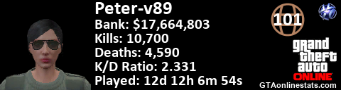 <a href="http://GTAonlinestats.com/showplayer/Peter-v89"><img src="http://GTAonlinestats.com/dmsignature/Peter-v89/sig.png" alt="Peter-v89" border="0" /></a>