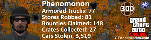 [URL=http://GTAonlinestats.com/showplayer/Phenomonon][IMG]http://GTAonlinestats.com/crimesignature/Phenomonon/sig.png[/IMG][/URL]