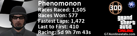 <a href="http://GTAonlinestats.com/showplayer/Phenomonon"><img src="http://GTAonlinestats.com/racesignature/Phenomonon/sig.png" alt="Phenomonon" border="0" /></a>