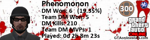 [URL=http://GTAonlinestats.com/showplayer/Phenomonon][IMG]http://GTAonlinestats.com/dmsignature/Phenomonon/sig.png[/IMG][/URL]