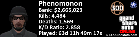 [URL=http://GTAonlinestats.com/showplayer/Phenomonon][IMG]http://GTAonlinestats.com/signature/Phenomonon/sig.png[/IMG][/URL]