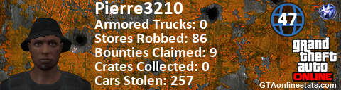 [URL=http://GTAonlinestats.com/showplayer/Pierre3210][IMG]http://GTAonlinestats.com/crimesignature/Pierre3210/sig.png[/IMG][/URL]