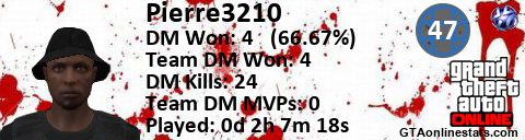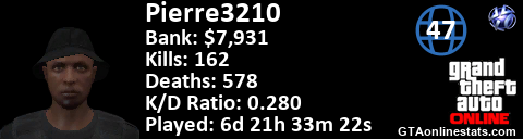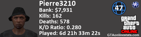 <a href="http://GTAonlinestats.com/showplayer/Pierre3210"><img src="http://GTAonlinestats.com/signature/Pierre3210/sig.png" alt="Pierre3210" border="0" /></a>