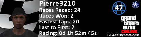 <a href="http://GTAonlinestats.com/showplayer/Pierre3210"><img src="http://GTAonlinestats.com/racesignature/Pierre3210/sig.png" alt="Pierre3210" border="0" /></a>