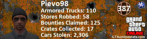<a href="http://GTAonlinestats.com/showplayer/Pievo98"><img src="http://GTAonlinestats.com/randomsignature/Pievo98/sig.png" alt="Pievo98" border="0" /></a>