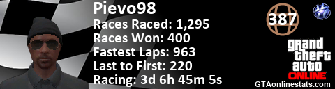 <a href="http://GTAonlinestats.com/showplayer/Pievo98"><img src="http://GTAonlinestats.com/racesignature/Pievo98/sig.png" alt="Pievo98" border="0" /></a>
