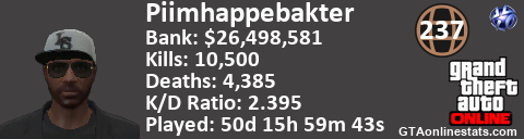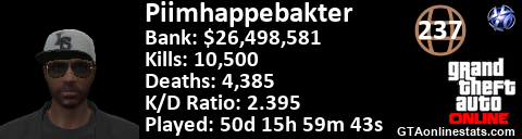 <a href="http://GTAonlinestats.com/showplayer/Piimhappebakter"><img src="http://GTAonlinestats.com/randomsignature/Piimhappebakter/sig.png" alt="Piimhappebakter" border="0" /></a>