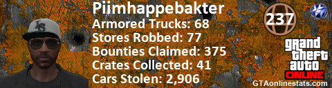 [URL=http://GTAonlinestats.com/showplayer/Piimhappebakter][IMG]http://GTAonlinestats.com/randomsignature/Piimhappebakter/sig.png[/IMG][/URL]