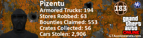 [URL=http://GTAonlinestats.com/showplayer/Pizentu][IMG]http://GTAonlinestats.com/randomsignature/Pizentu/sig.png[/IMG][/URL]