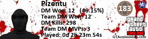 [URL=http://GTAonlinestats.com/showplayer/Pizentu][IMG]http://GTAonlinestats.com/dmsignature/Pizentu/sig.png[/IMG][/URL]