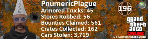 [URL=http://GTAonlinestats.com/showplayer/PnumericPlague][IMG]http://GTAonlinestats.com/crimesignature/PnumericPlague/sig.png[/IMG][/URL]