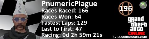 <a href="http://GTAonlinestats.com/showplayer/PnumericPlague"><img src="http://GTAonlinestats.com/racesignature/PnumericPlague/sig.png" alt="PnumericPlague" border="0" /></a>