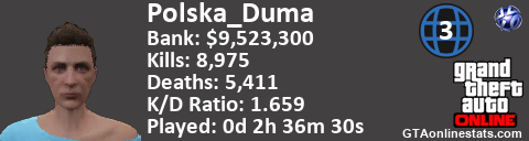 [URL=http://GTAonlinestats.com/showplayer/Polska_Duma/4][IMG]http://GTAonlinestats.com/signature/Polska_Duma/4/sig.png[/IMG][/URL]